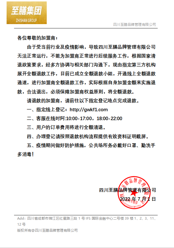 四川至膳开始退回加盟费啦!四川至膳旗下加盟受害者运用英国哲学家培根的话说:“一次不公正的审判,其恶果甚至超过十次犯罪。”人民法院应该维护人民群众的利益,而不是维护少数利益集团的利益,在大面积投资者举报后,家族多次聚集在四川至膳总部,讨要退费方案。在上个月相关部门终于出手! 四川至膳在最后通过协商,进行的第三方转让退费。